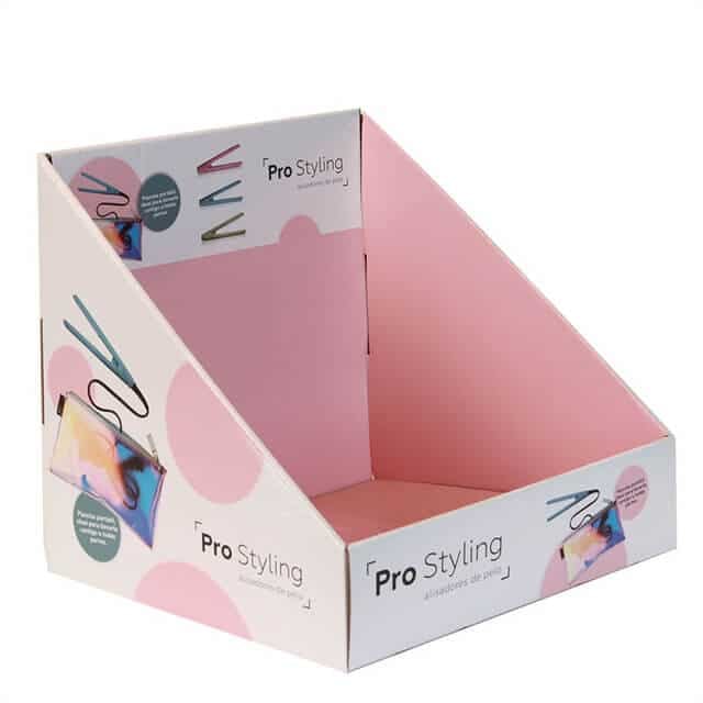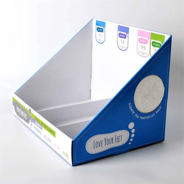 Corrugated counter display box with custom printed designs and sizing.