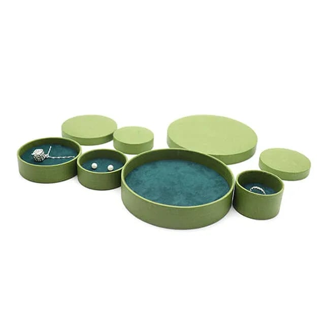 a bunch of green custom round jewelry boxes and some of them have jewelry inside